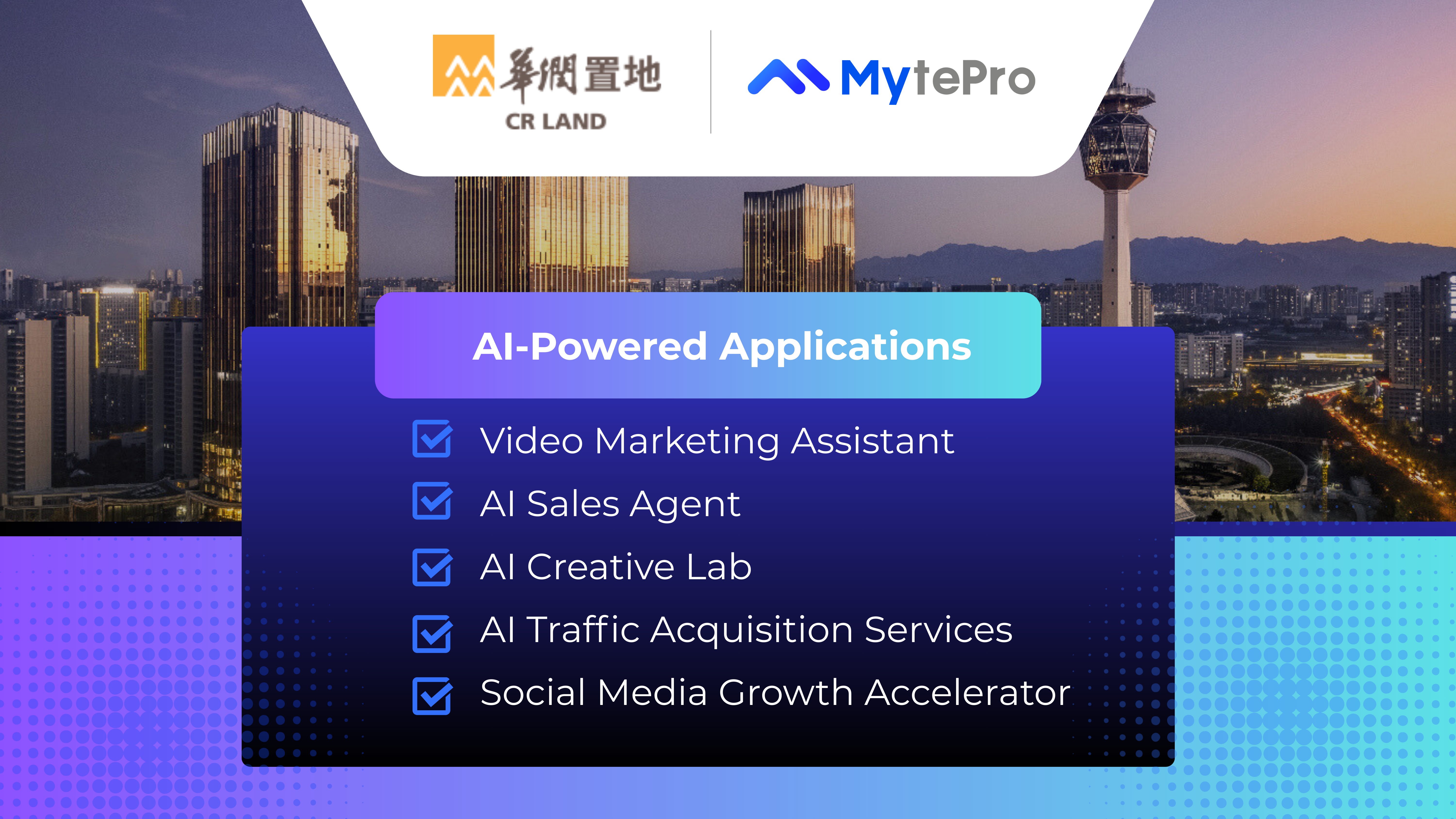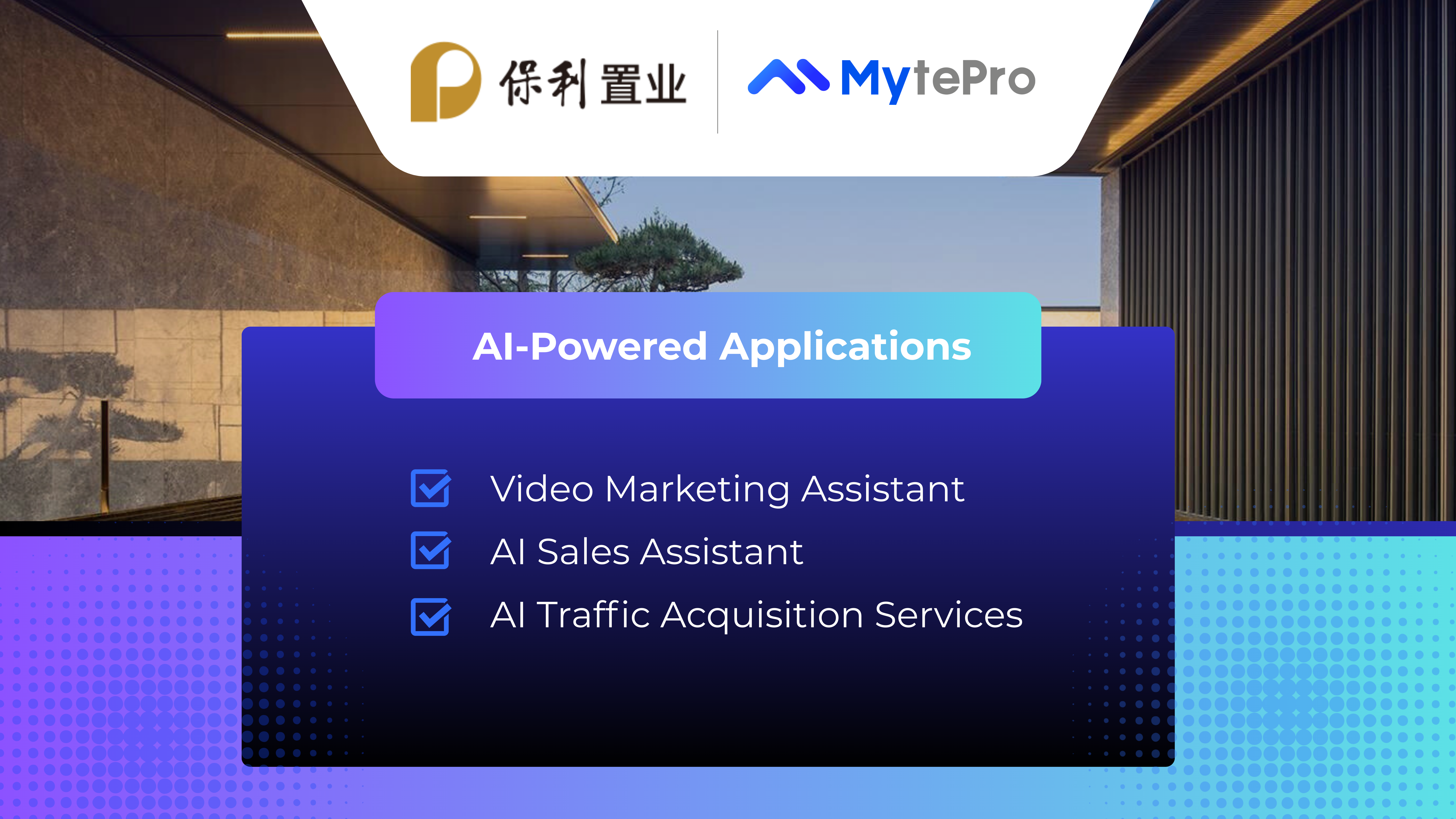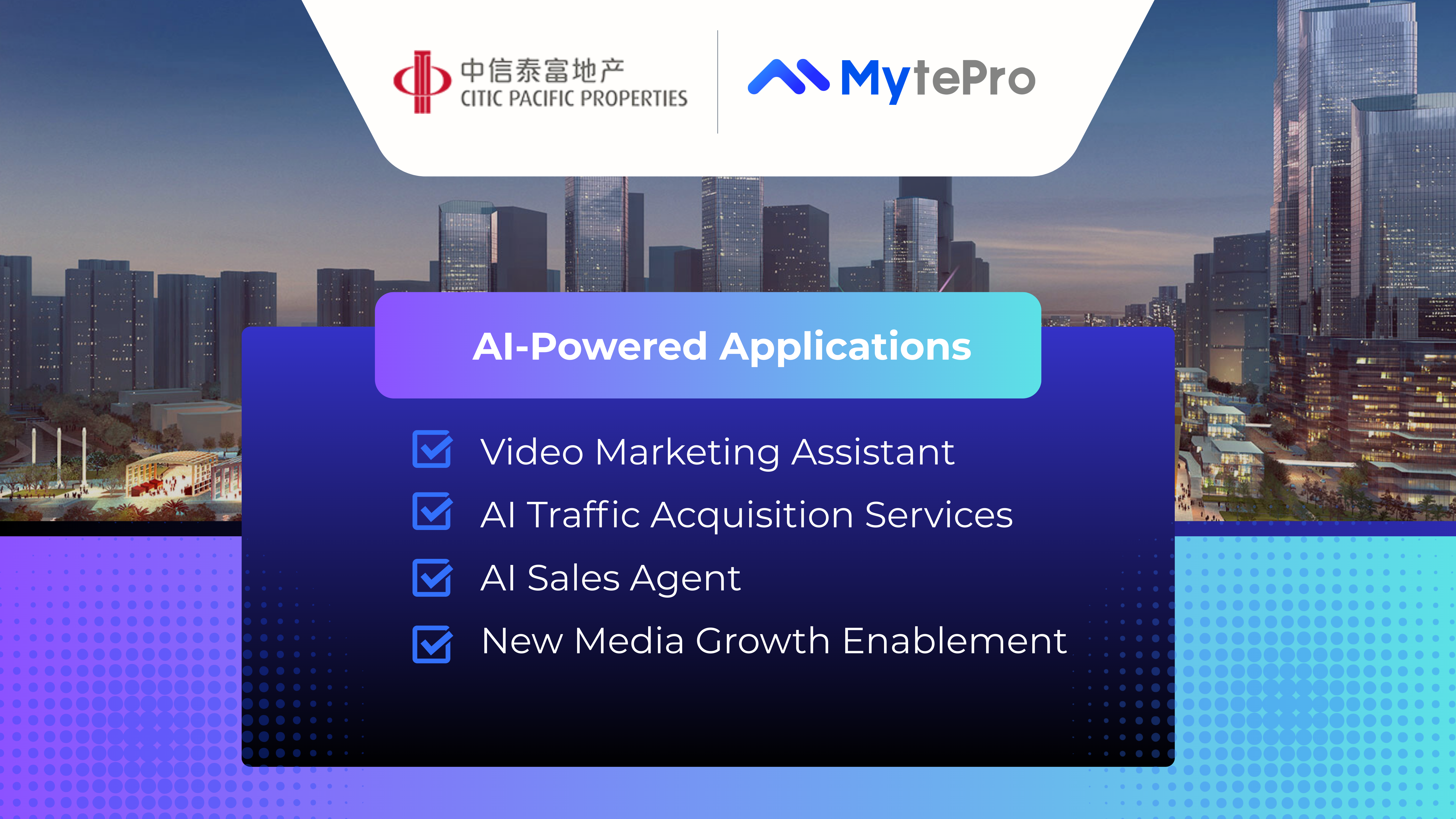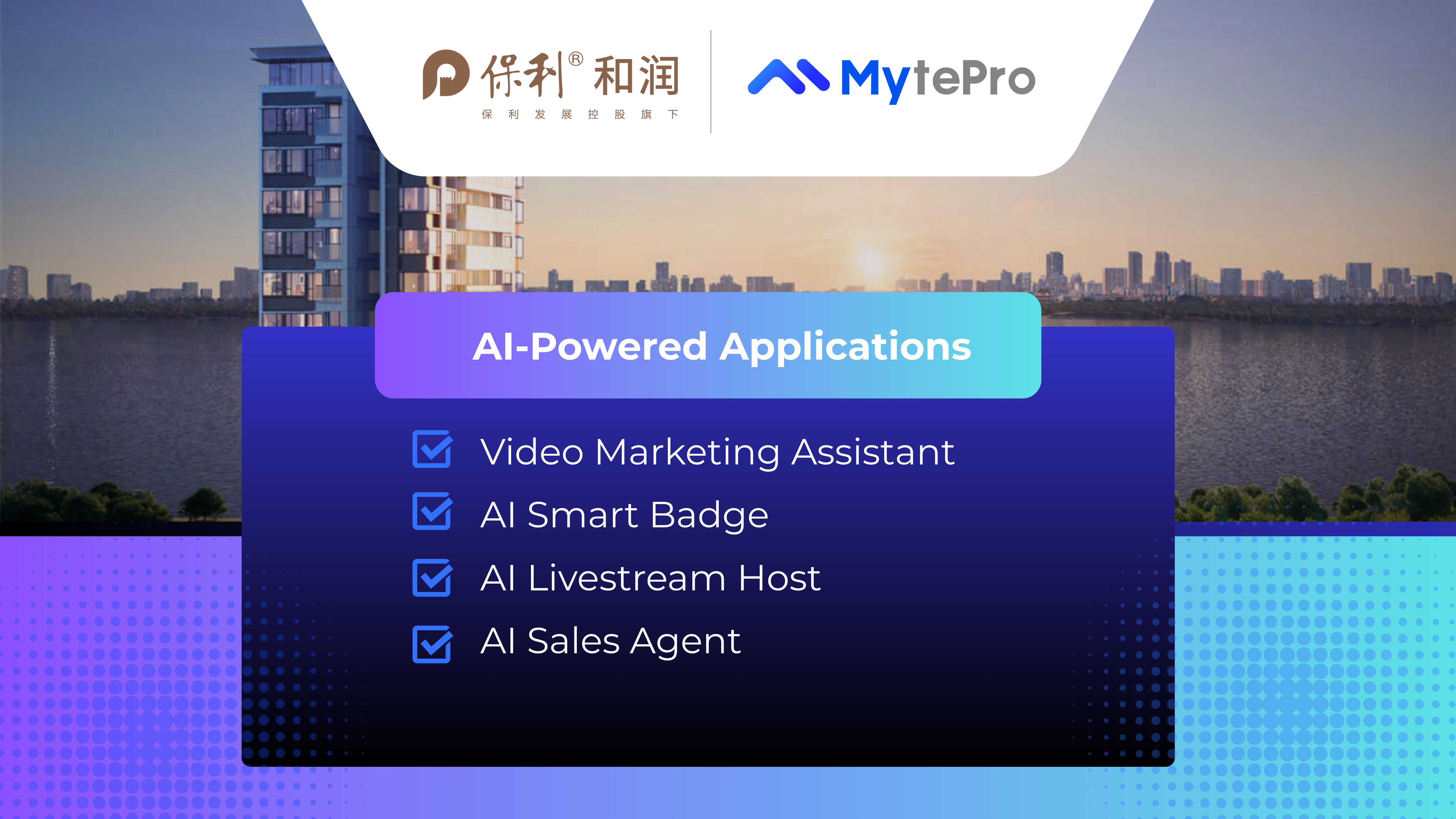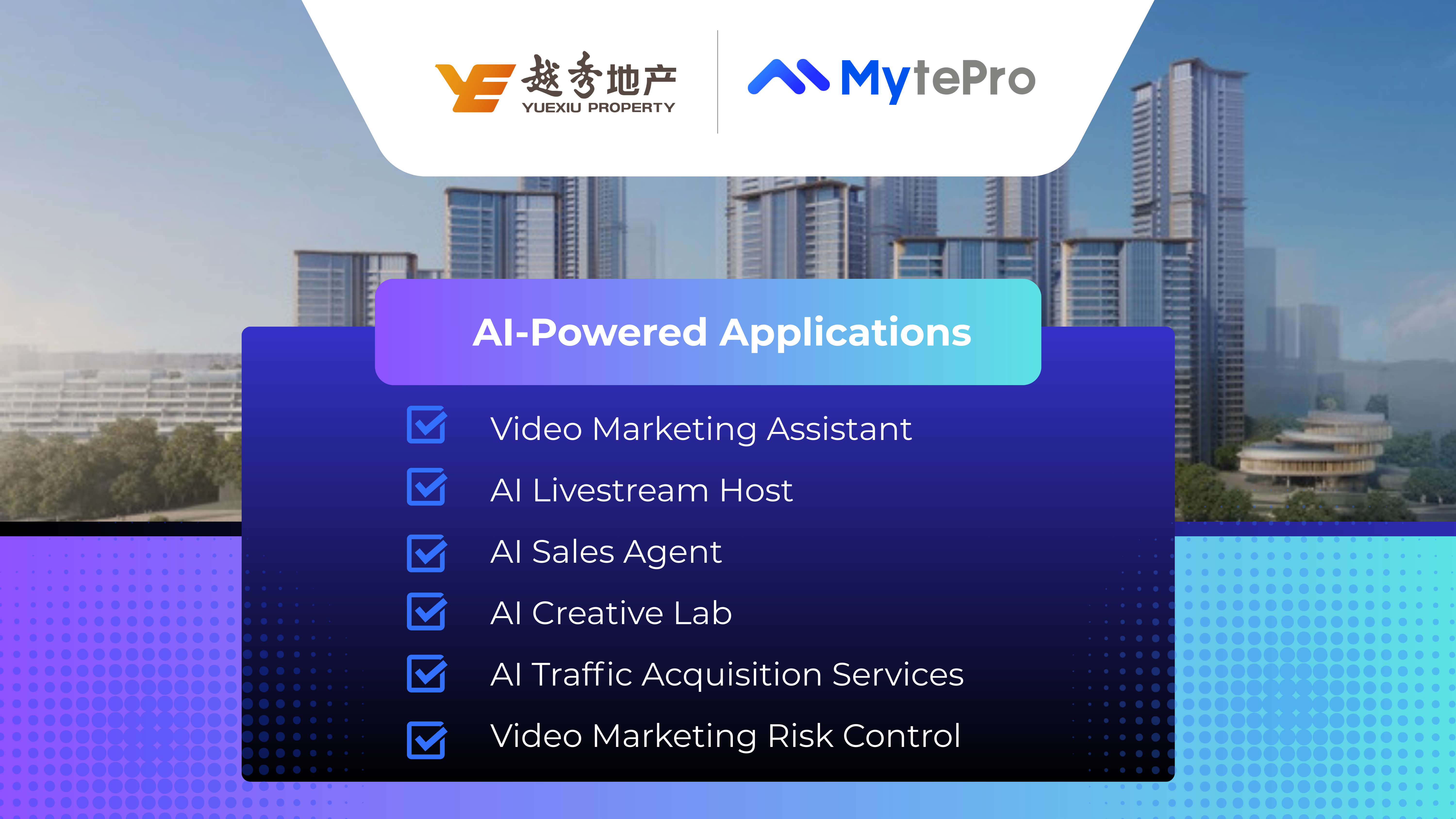 MytePro offers a comprehensive suite of AI-powered marketing tools designed to support developers’ online marketing efforts. These solutions applies to various key scenarios, from livestreaming and short-form video to on-site sales centers,helping developers acquire customers more efficiently and at scale.